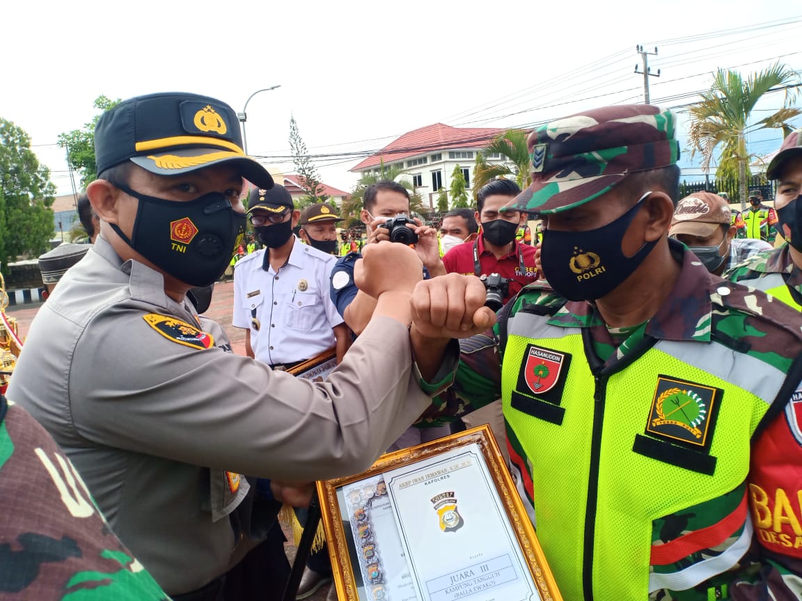 Kapolres Sinjai AKBP Iwan Irmawan, menyerahkan penghargaan kepada 3 (tiga) pilar yakni Bhabinkamtibmas, Babinsa dan Kepala Desanya.
