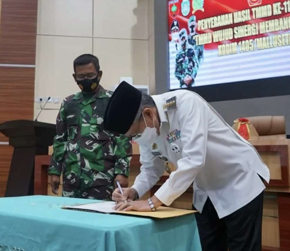 Penutupan kegiatan TMMD ke-110 ditandai dengan penyerahan hasil kegiatan oleh Dandim 1405/Mallusetasi Letkol Czi Arianto Wibowo kepada Wali Kota Parepare Taufan Pawe, disaksikan Danrem 141/Toddopuli Brigjen TNI Djashar Djamil, di Ruang Pola Kantor Walikota Parepare, Rabu 31 Maret 2021.