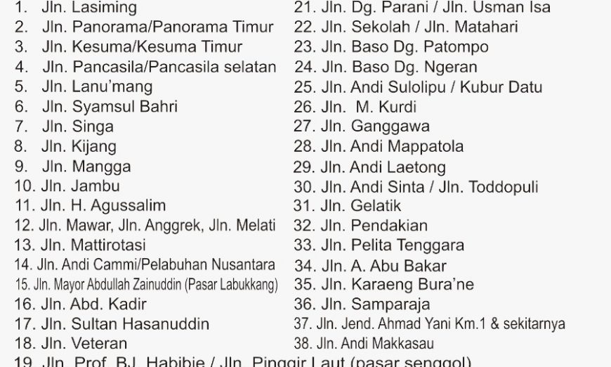 Adapun 38 titik yang tidak terdistribusi air selama tiga hari ke depan adalah Jalan Lasiming, Jalan Panorama dan Panorama Timur, Jalan Pancasila/Pancasila Selatab, Jalan Lanu’mang, Jalan Syamsul Bahri, Jalan Singa, Jalan Kijang, Jalan Mangga, Jalan Jambu, Jalan Agussalim, Jalan Mawar, Anggrek, Melati, Jalan Mattirotasi, Jalan Andi Cammi/Pelabuhan Nusantara, Jalan Mayor Abdullah Zainuddin (Pasar Labukkang), Jalan Abd Kadir, Jalan Sultan Hasanuddin, Jalan Veteran, Jalan Alwi Abdul Jalil Habibie/Jalan Pinggir Laut (Pasar Senggol), Jalan Bau Massepe (mulai perempatan Jalan Baronang sampai dengan Masjid Raya), Jalan Dg Parani/Usman Isa, Jalan Sekolah/Jalan Matahari, Jalan Baso Dg Patompo, Jalan Baso Dg Ngerang, Jalan Andi Sulolipu/Kubur Datu, Jalan M Kurdi, Jalan Ganggawa, Andi Mappatola, Andi Laetong, Andi Sinta/Toddopuli, Gelatik, Pendakian, Pelita Tenggara, Andi Abu Bakar, Karaeng Burane, Samparaja, Jalan Jend Ahmad Yani Km 1 dan sekitarnya, serta Jalan Andi Makkasau. (*)