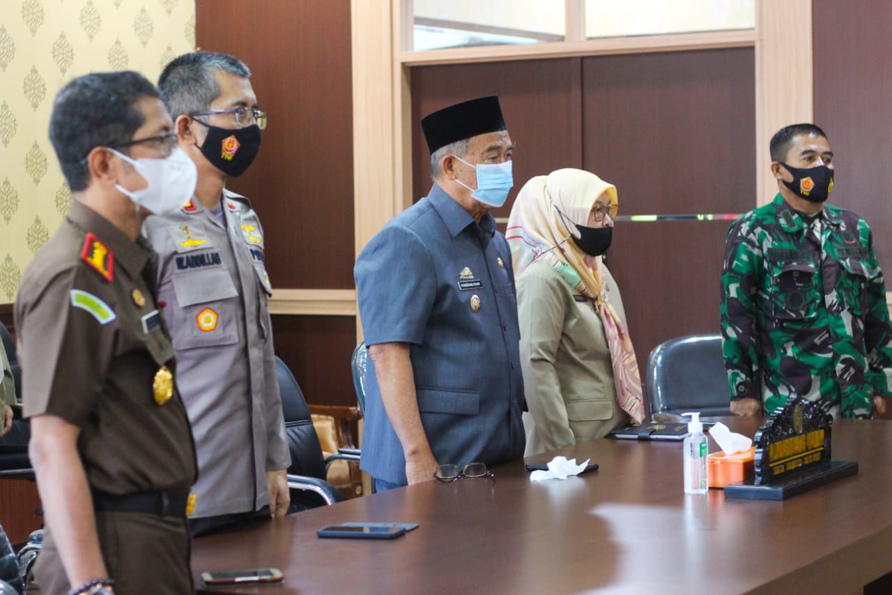Pangerang Rahim didampingi Forkopimda, yakni Kapolres Parepare AKBP Welly Abdillah, Dandim 1405 Mallusetasi Letkol Czi Arianto Wibowo, Kajari Parepare Didi Haryono, dan Ketua DPRD Parepare Andi Nurhatina Tipu, saat mengikuti rakor secara virtual di ruang kerja Wakil Walikota Parepare, Senin (3/5/2021).