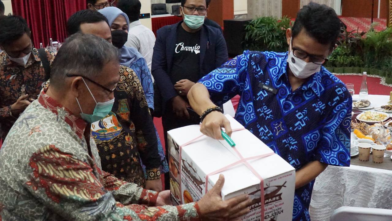 Penyerahan cendera mata berupa makanan khas Kota Parepare Roti Mantau ini diserahkan langsung oleh Wakil Wali Kota Parepare Pangerang Rahim, mewakili Wali Kota Parepare Taufan Pawe yang berhalangan sehingga tak sempat hadir.