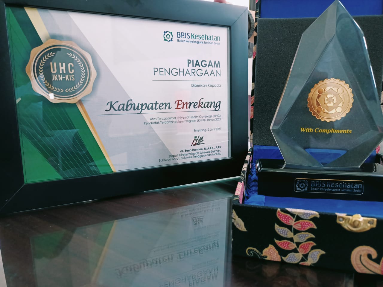 Piagam dan trophy penghargaan ini diserahkan Deputi Direksi Wilayah BPJS Kesehatan Wilayah Sulselbar, Sulteng dan Maluku, dr Beno Herman, M.ARS., AKK, kepada Bupati Enrekang Muslimin Bando.