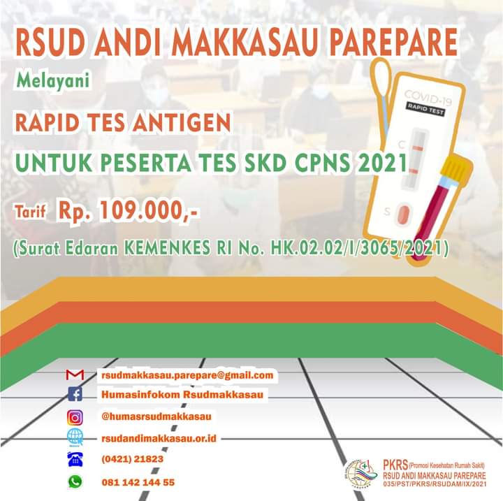 “Informasi untuk masyarakat yang akan bepergian ke luar daerah serta adik-adik sekalian peserta ujian seleksi CPNS tahun 2021. Bahwa berdasarkan Surat Edaran Kementerian Kesehatan Republik Indonesia maka tarif pemeriksaan Rapid tes Antigen di RSUD Andi Makkasau turun menjadi Rp.109.000,” katanya.