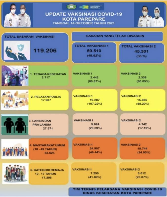 Terkait vaksinasi, data per 14 Oktober 2021, dari 119.206 sasaran vaksinasi di Parepare, telah divaksin satu 59.510 orang (49,92 persen), vaksin dua 45.301 orang (38 persen), dan vaksin tiga khusus tenaga kesehatan 1.737 (63,93 persen).