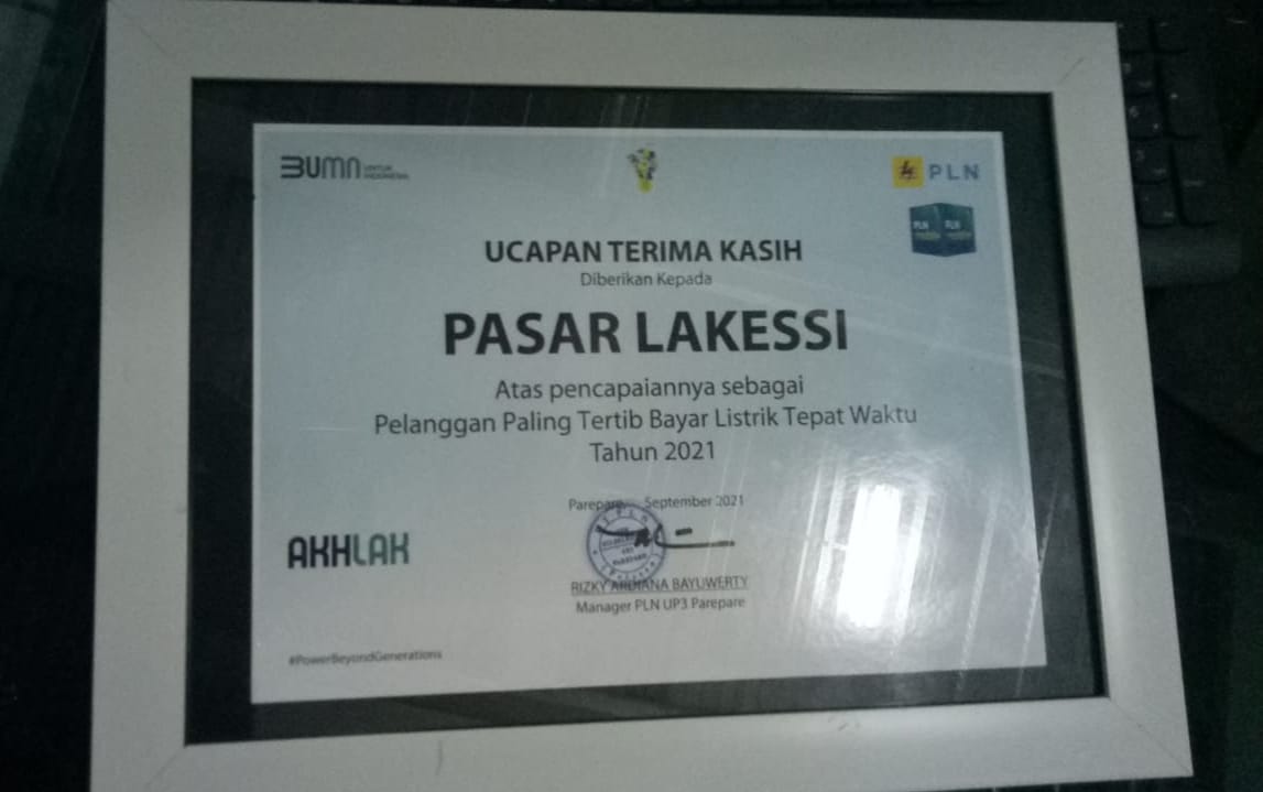 Bukti pengelolaan pasar Lakessi tertib membayar listrik ditandai dengan penerimaan Sertifikat Ucapan terima kasih dari pihak PLN Parepare.
