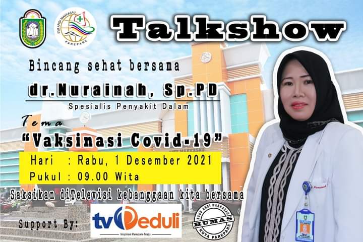 Pentingnya vaksinasi ini menjadi fokus ulasan dokter RSUD Andi Makkasau Kota Parepare, dr Nurainah SpPD dalam talkshow bertema Vaksinasi Covid-19 di Stasiun Televisi (TV) Peduli, Rabu 1 Desember 2021.