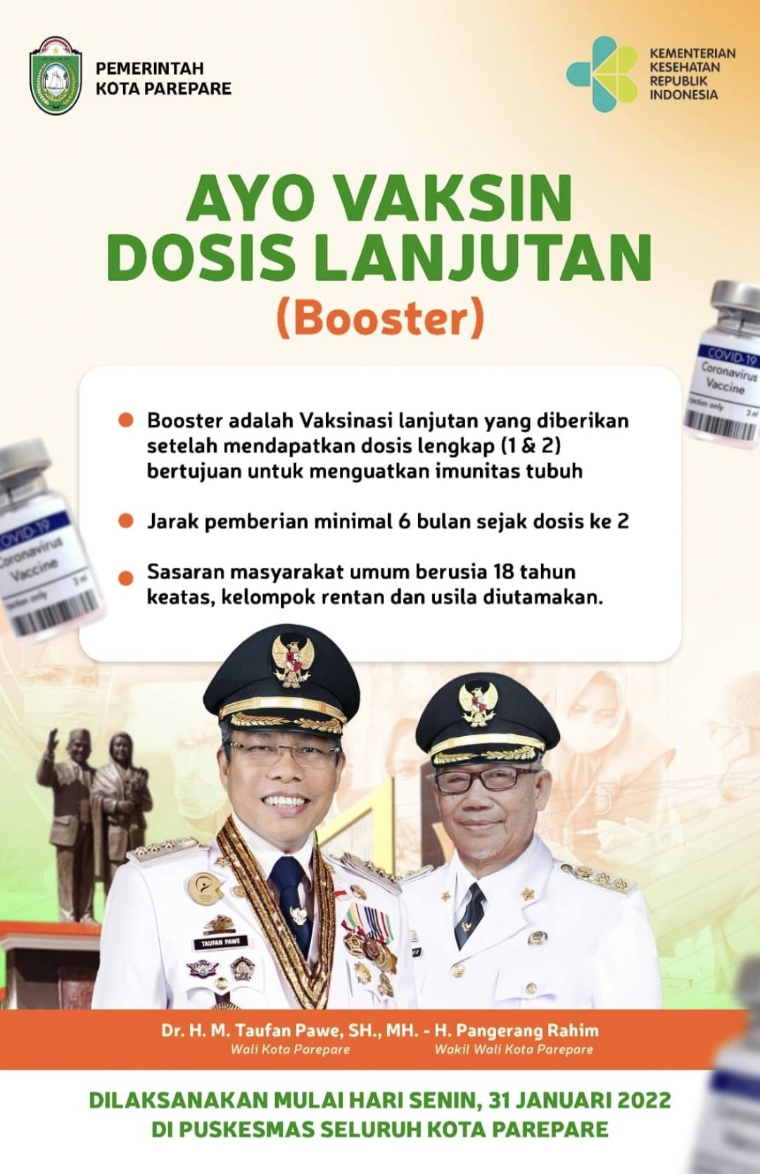 Sebelumnya, Wali Kota Parepare, Dr HM Taufan Pawe mengajak masyarakat yang telah mendapatkan vaksin dosis lengkap 1 dan 2, untuk vaksinasi dosis 3 atau lanjutan. Vaksinasi lanjutan ini dimulai Senin, 31 Januari 2022, serentak di seluruh Puskesmas di Parepare.
