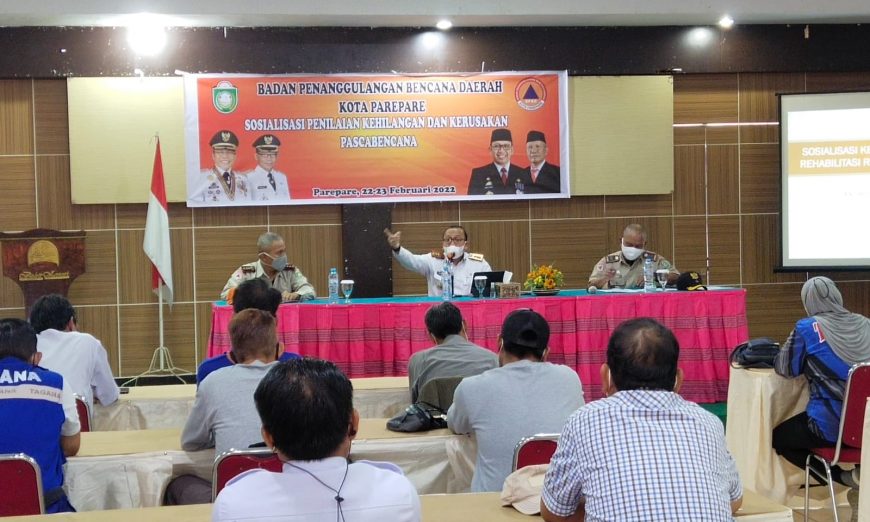 PAREPARE, KLUPAS.COM – Pemerintah Kota Parepare melalui Badan Penanggulangan Bencana Daerah (BPBD) melakukan Sosialisasi Penilaian Kehilangan dan Kerusakan Pascabencana di Hotel Bukit Kenari Parepare, Rabu 23 Februari 2022.