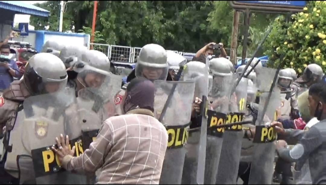 Situasi pun menjadi ricuh setelah massa melakukan pembakaran di depan pintu masuk terminal penumpang Pelabuhan Nusantara. Terjadi aksi saling dorong antara pengunjuk rasa dengan pihak kepolisian. Polisi mengamankan dua pengunjuk rasa yang kedapatan membawa senjata tajam (Sajam).