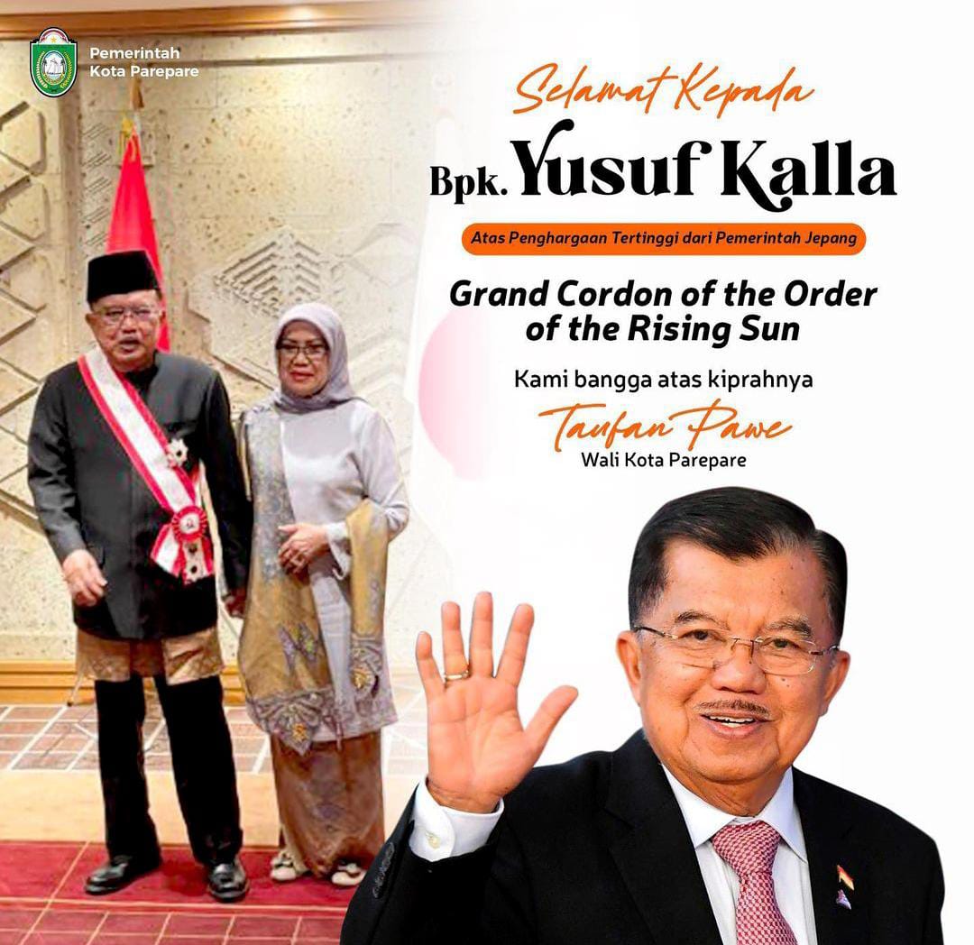 PAREPARE, KLUPAS.COM – Wali Kota Parepare Taufan Pawe menyampaikan selamat kepada Jusuf Kalla (JK) atas penghargaan yang diraih dari Pemerintah Jepang.