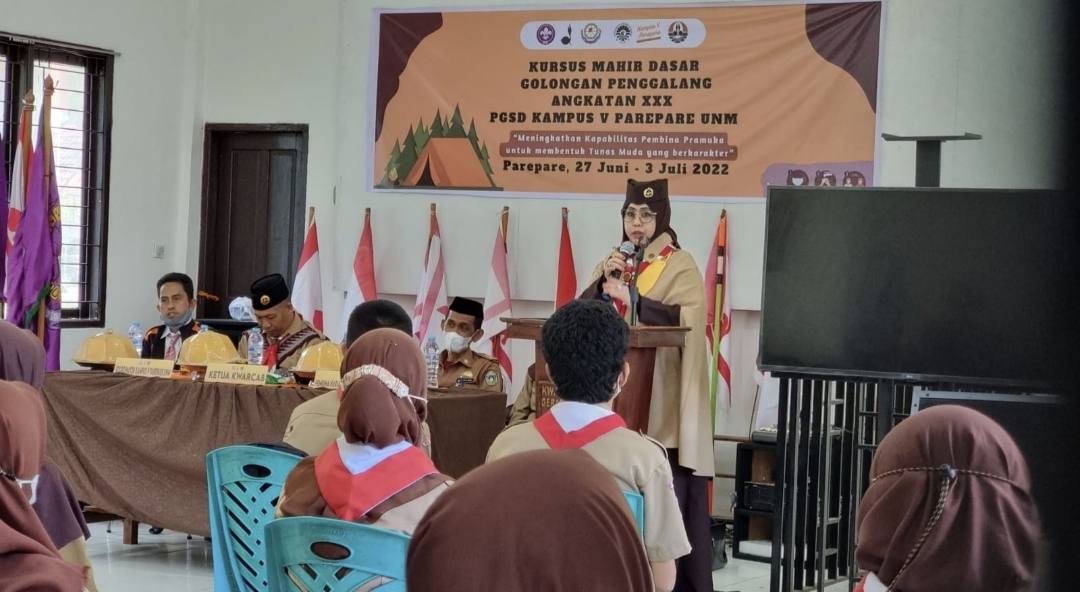 PAREPARE, KLUPAS.COM – Ketua Kwartir Cabang (Kwarcab) Pramuka Parepare, Hj Erna Rasyid Taufan membuka pelaksanaan kegiatan Kursus Mahir Dasar (KMD). KMD yang dikhususkan untuk golongan penggalang angkatan XXX PGSD Kampus V Parepare UNM ini digelar di kantor Pramuka Parepare, Senin, 27 Juni 2022.