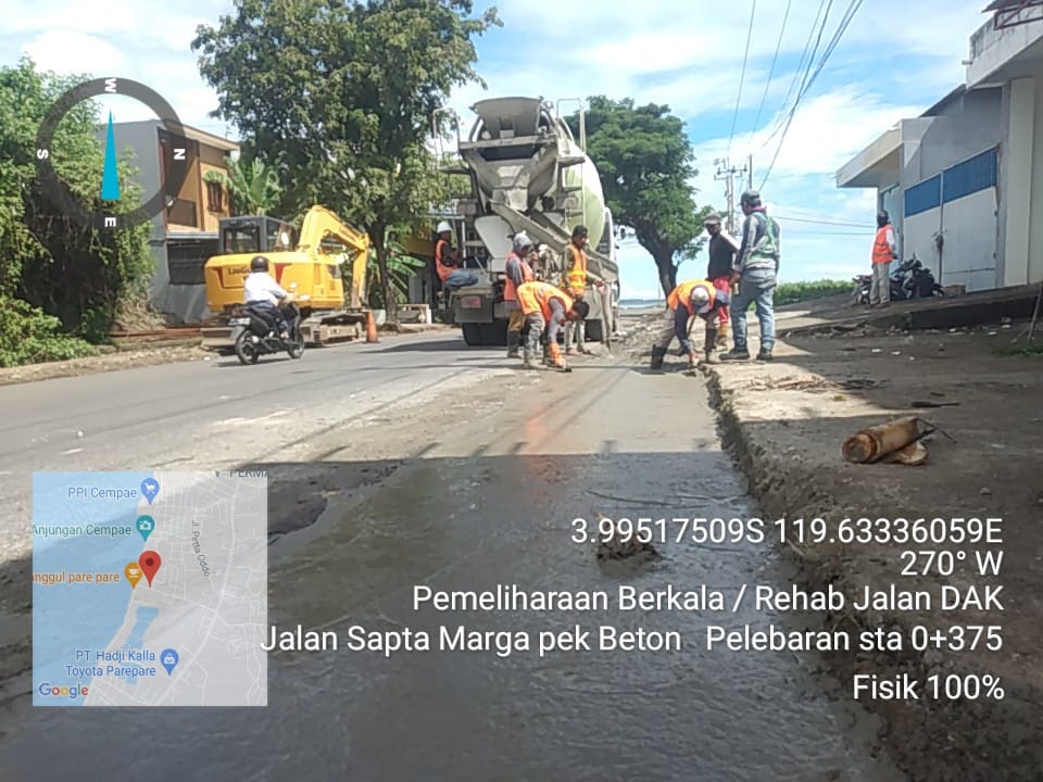 Pelaksana Tugas Kepala Dinas PUPR Kota Parepare, Samsuddin Taha mengatakan, rehabilitasi jalan di beberapa ruas yang tersebar salah satunya Jalan Sapta Marga, Kelurahan Watang Soreang, Kecamatan Soreang (akses menuju Anjungan Cempae).