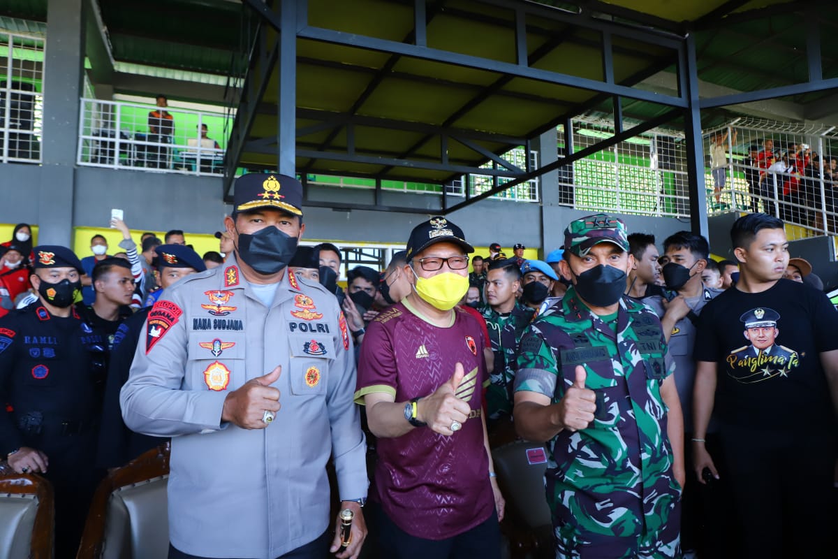 PAREPARE, KLUPAS.COM – Wali Kota Parepare, Taufan Pawe, bersama Pangdam XIV/Hasanuddin Mayjen TNI Andi Muhammad Bau Sawa Mappanyukki, dan Kapolda Sulsel Irjen Pol Nana Sudjana nonton bareng pertandingan PSM Makassar melawan Bali United, di Stadion Gelora BJ Habibie (GBH) Kota Parepare, Sulawesi Selatan, Jumat, 29 Juli 2022.