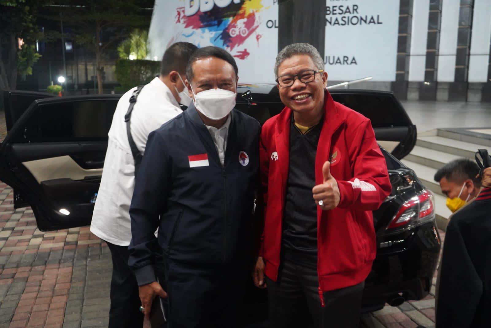 Diketahui, sebelum memasuki kantor Kemenpora RI, Taufan Pawe terlebih dahulu diberikan jaket berwarna merah dengan lambang Menpora RI.