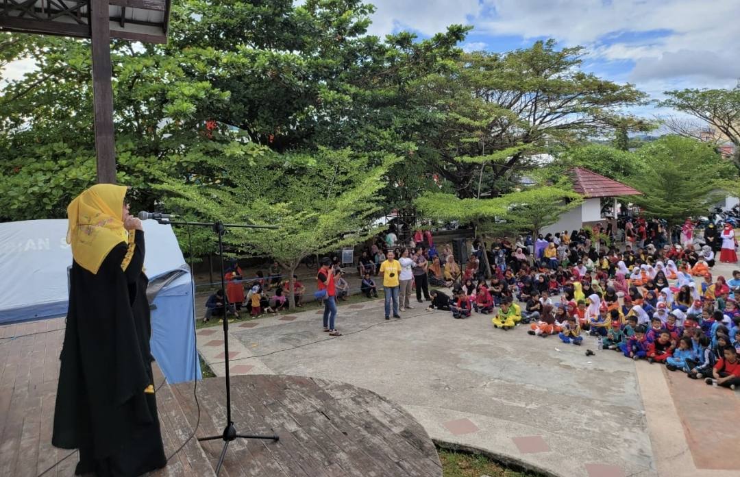 Usai bernyanyi, Erna pun berinteraksi tanya jawab dengan mereka sesuai isi lagu. “Bangun tidurku terus mandi tidak lupa menggosok gigi. Betul? Sorakan mengiyakan dari anak-anak lantang bersahutan. Erna lalu melanjutkan nyanyian yang diikuti ratusan anak-anak SD itu. “Habis mandi kutolong ibu membersihkan tempat tidurku. Apakah kita jalankan semuanya? Kalau kita jalankan berarti kita adalah anak yang baik, mau jadi anak yang baik?” lagi-lagi diiyakan oleh anak-anak yang hadir.