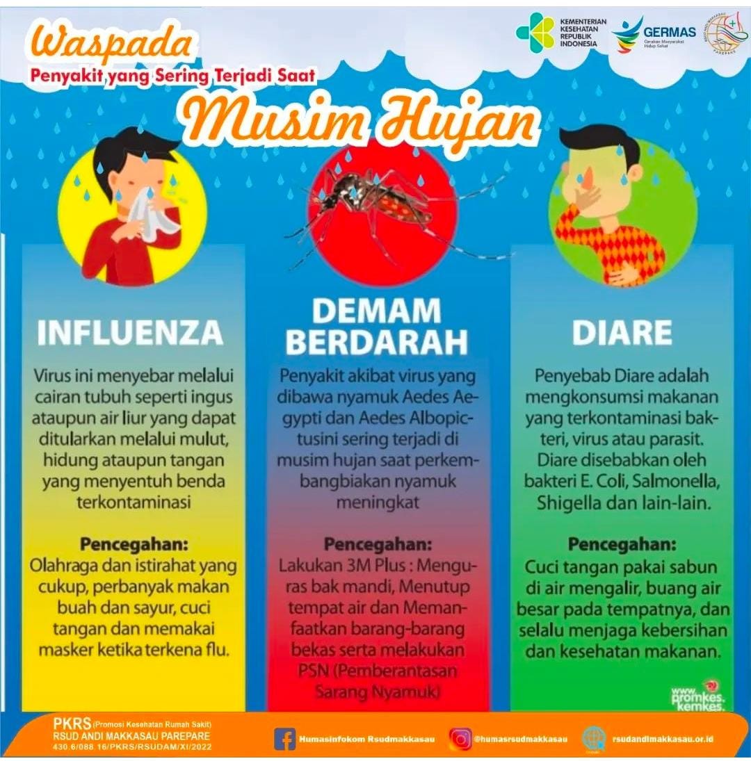 Kabid Infokom RSUD Andi Makkasau Parepare, Hj Mukarramah mengungkapkan, ada beberapa penyakit yang sering terjadi saat musim hujan, yaitu Diare, Demam Berdarah, dan Influenza.