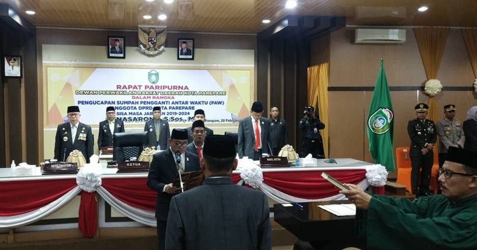 PAREPARE, KLUPAS.COM – Wali Kota Parepare, Taufan Pawe, menghadiri rapat paripurna dalam rangka Pengucapan Sumpah Pengganti Antar Waktu (PAW) Anggota DPRD Kota Parepare Sisa Masa Jabatan 2019-2024 yang berlangsung di Ruang Rapat Paripurna Lantai III Gedung DPRD Kota Parepare, Senin, 20 Februari 2023.