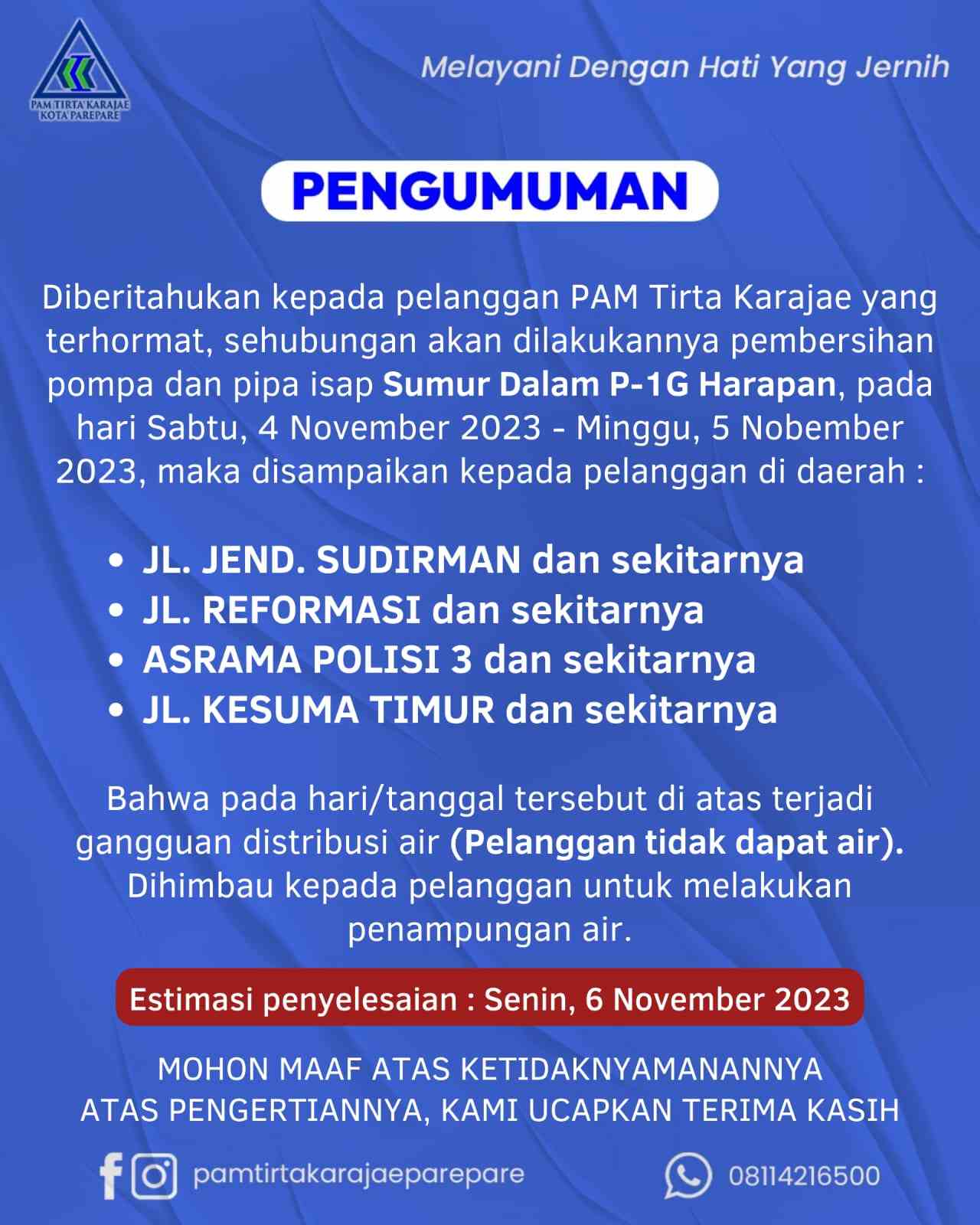 “Diberitahukan kepada pelanggan PAM Tirta Karajae yang terhormat, sehubungan dilakukannya pembersihan pompa dan pipa isap sumur dalam P-1G Harapan, sehingga mengakibatkan distribusi air ke pelanggan terganggu pada hari Sabtu dan Ahad, 4-5 November 2023,” bunyi pengumuman PAM Tirta Karajae.