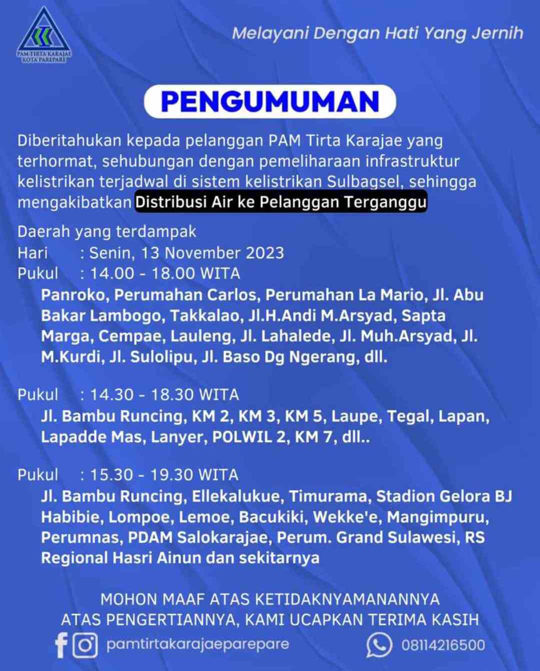 Melalui akun media sosial resminya, PAM Tirta Karajae mengumumkan beberapa wilayah terdampak akibat gangguan distribusi air itu pada jam-jam tertentu.