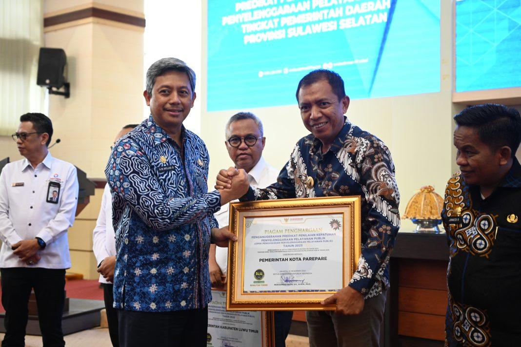 Ombudsman RI menganugerahkan predikat kepatuhan sebagai hasil penilaian terhadap kepatuhan standar pelayanan publik yang diterapkan oleh Pemerintah Kota Parepare.