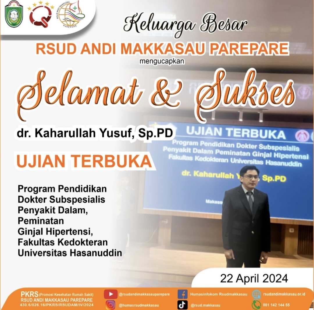 PAREPARE, KLUPAS.COM – Keluarga Besar dan manajemen RSUD Andi Makkasau Kota Parepare mengucapkan selamat dan sukses atas Ujian Terbuka dr Kaharullah Yusuf Sp.PD.
