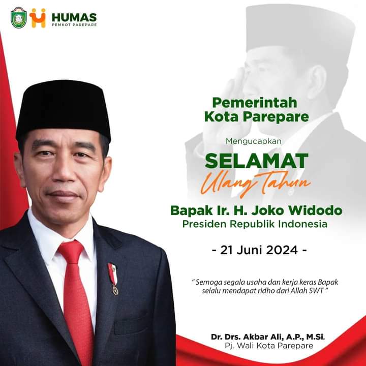 PAREPARE, KLUPAS.COM – Penjabat Wali Kota Parepare, Akbar Ali atas nama Pemerintah Kota Parepare mengucapkan selamat ulang tahun ke-63, Presiden RI Joko Widodo (Jokowi) pada Jumat 21 Juni 2024.