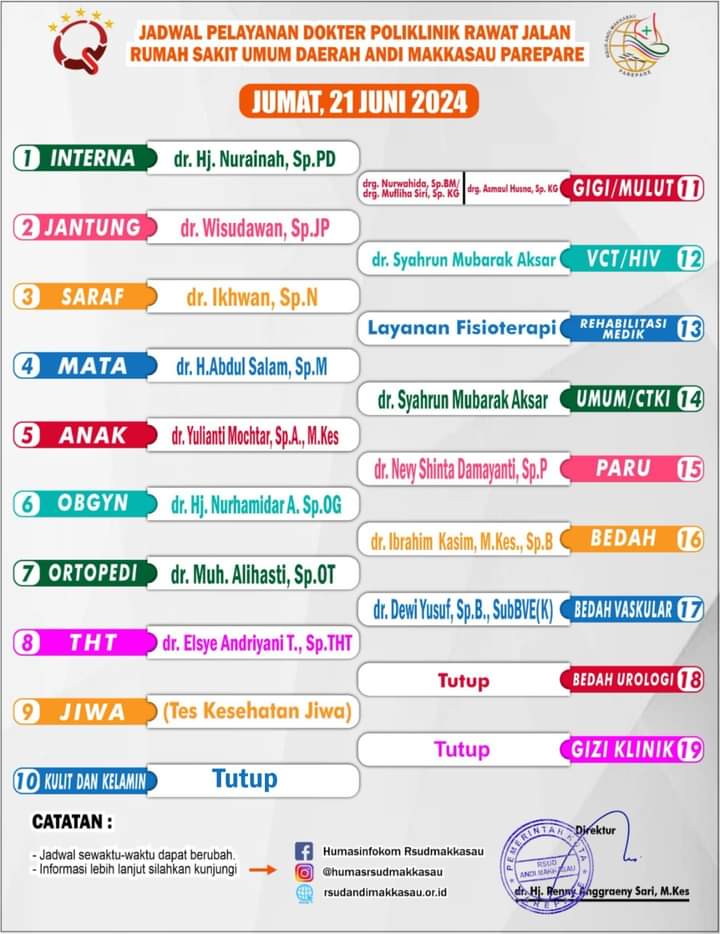 “Informasi Jadwal Poliklinik Rawat Jalan RSUD Andi Makkasau Kota Parepare, Jumat, 21 Juni 2024,” tulis RSUD Andi Makkasau melalui akun media sosial resminya.