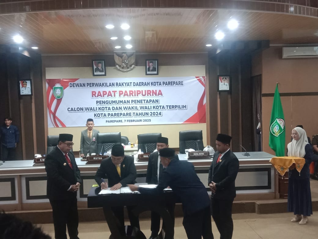 PAREPARE, KLUPAS.COM – Penjabat (Pj) Wali Kota Parepare, Abdul Hayat Gani, menghadiri Rapat Paripurna DPRD dalam rangka Pengumuman Penetapan Calon Wali Kota dan Wakil Wali Kota Parepare Terpilih Tahun 2025-2030 di Ruang Rapat Paripurna Gedung DPRD Kota Parepare, Jumat (7/2/2025).
