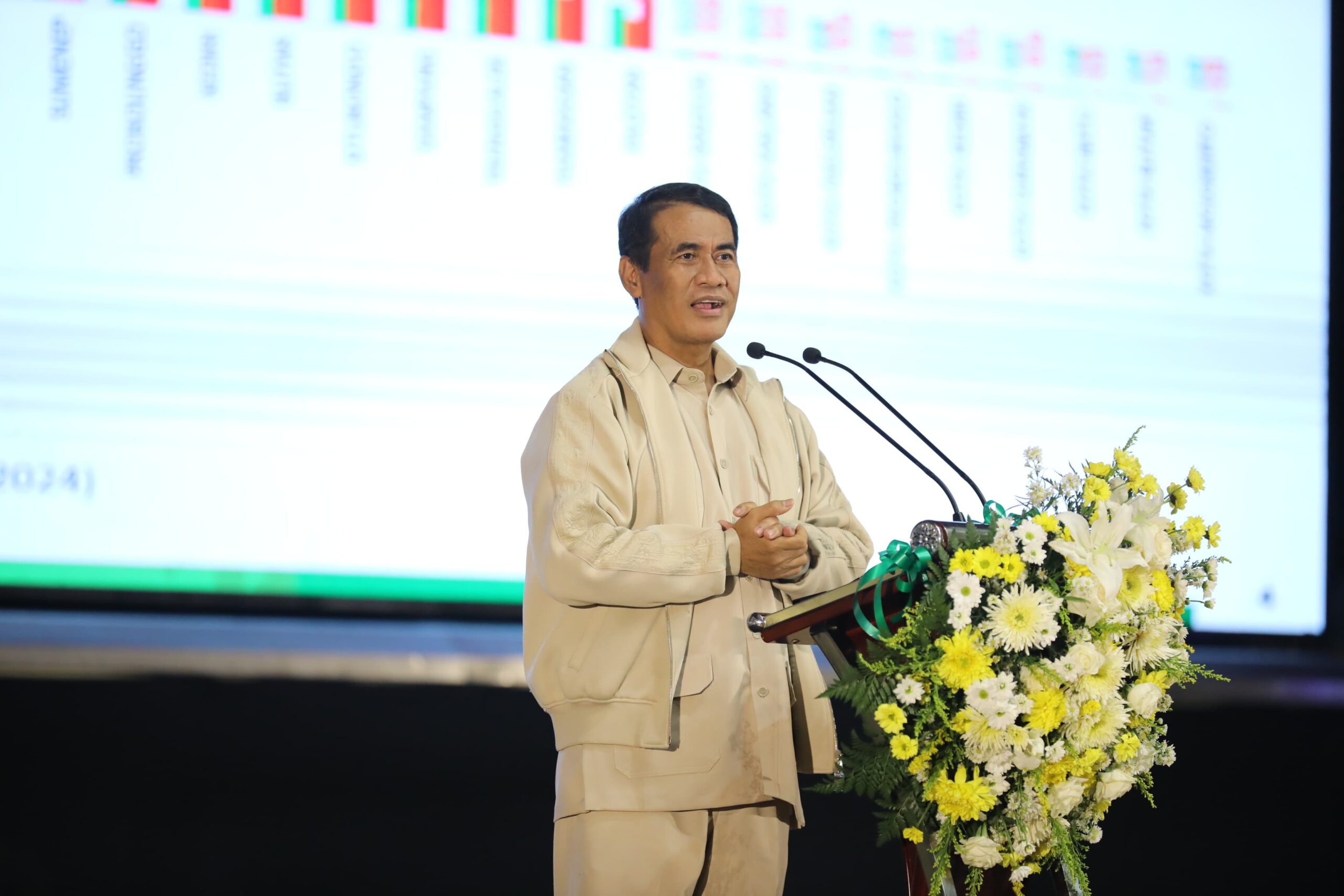 “Saya minta Menteri Pertanian berdiri. Tepuk tangan. kita harus mengakui prestasinya. Saya hormat karena saudara sekarang adalah pahlawan bangsa,” ujar Presiden.