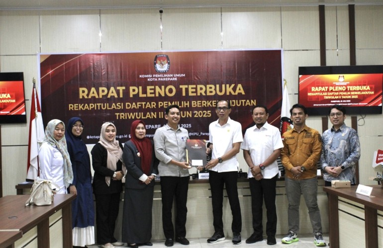 PAREPARE, KLUPAS.COM – Komisi Pemilihan Umum (KPU) Kota Parepare menggelar rapat pleno terbuka, Rekapitulasi Daftar Pemilih Berkelanjutan (PDPB) Triwulan II Tahun 2025 di Aula Media Centre KPU Kota Parepare, Rabu (2/7/2025).