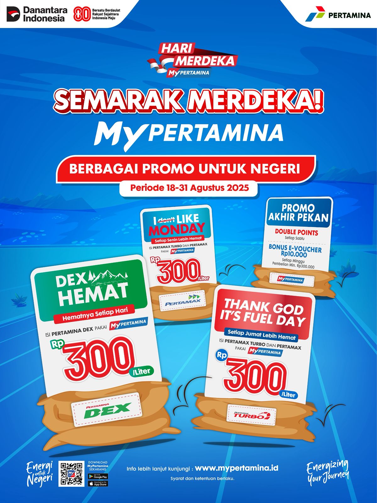 Pertamina memberikan potongan harga spesial sebesar Rp 300 per liter untuk pembelian BBM berkualitas Pertamax Turbo, Pertamax, dan Pertamina Dex menggunakan aplikasi MyPertamina. Promo ini berlaku khusus pada 18-31 Agustus 2025.
