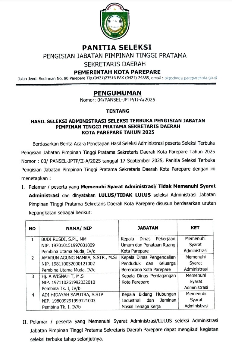 PAREPARE, KLUPAS.COM – Perebutan kursi Sekretaris Daerah (Sekda) Kota Parepare memasuki babak baru. Panitia Seleksi Jabatan Pimpinan Tinggi Pratama (JPTP) resmi mengumumkan hasil seleksi administrasi, dan hanya empat pejabat dinyatakan lolos untuk melangkah ke tahap selanjutnya.
